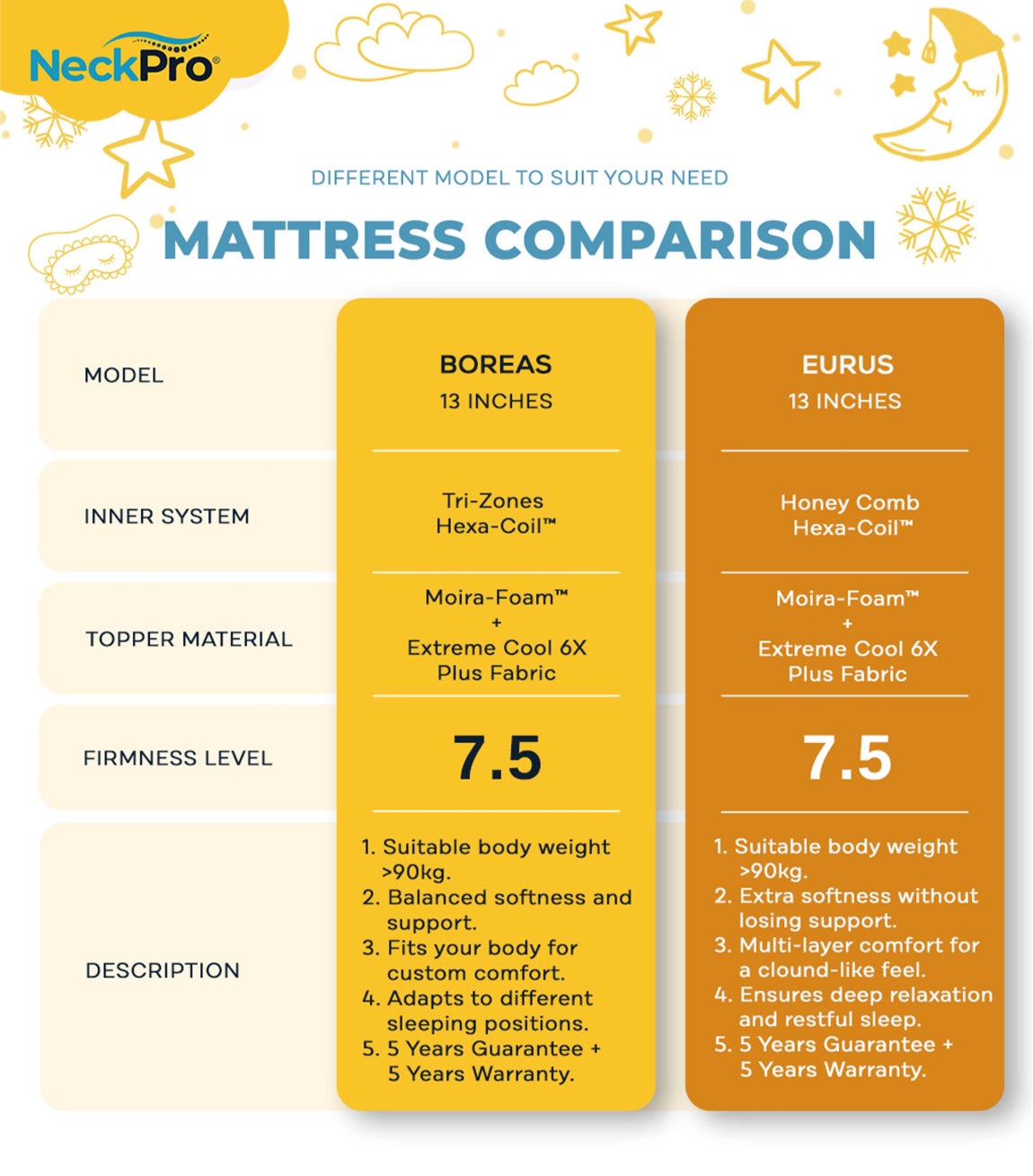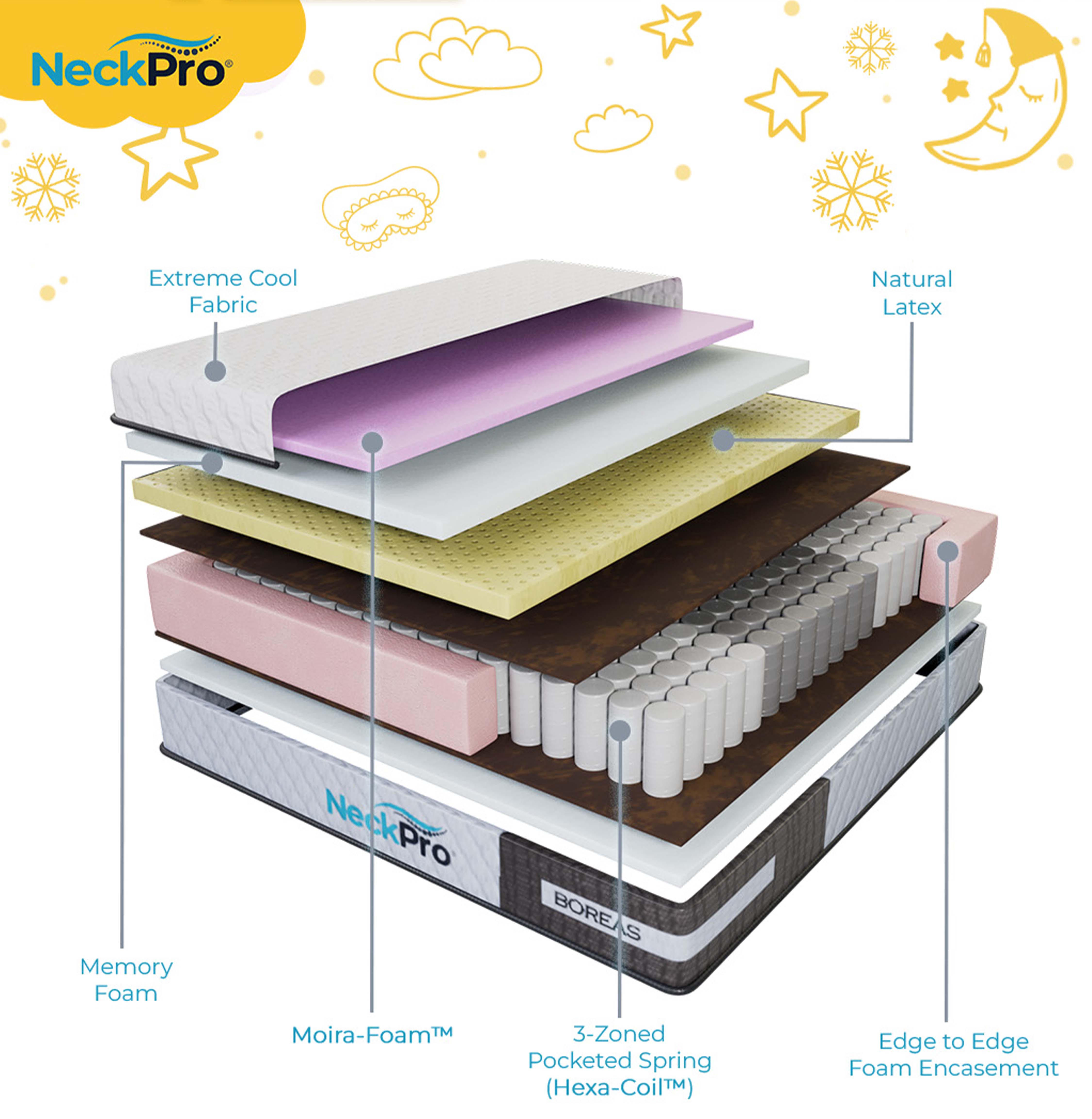 The NeckPro Olympus Series is celebrated for its luxurious sleeping experience, premium export quality, and chiropractor-approved design. Named after the Greek God of the North Wind, the Boreas offers a refreshing, cool, and restorative sleep environment with its Extreme Cool 6X Fabric and carefully balanced comfort layers.