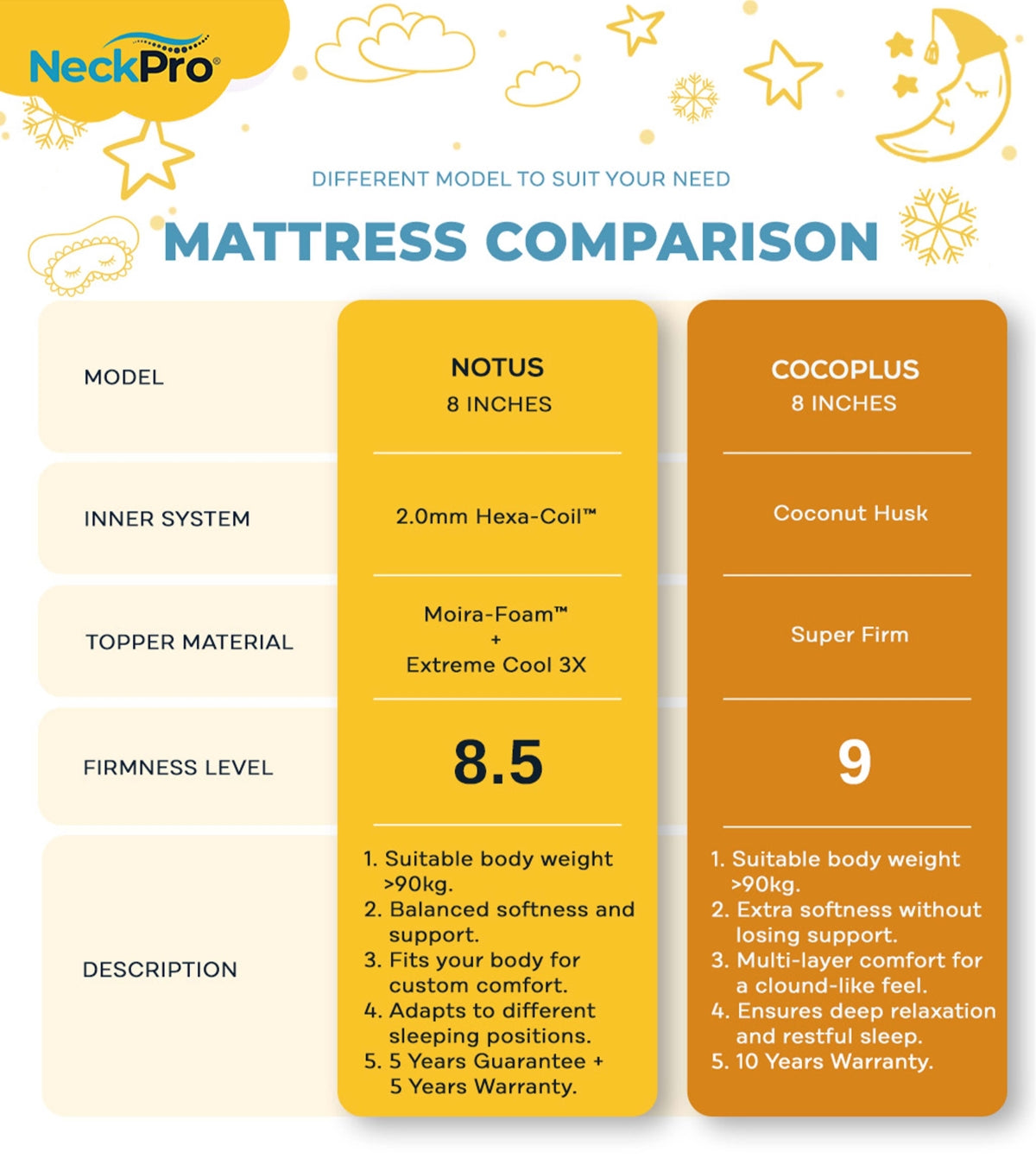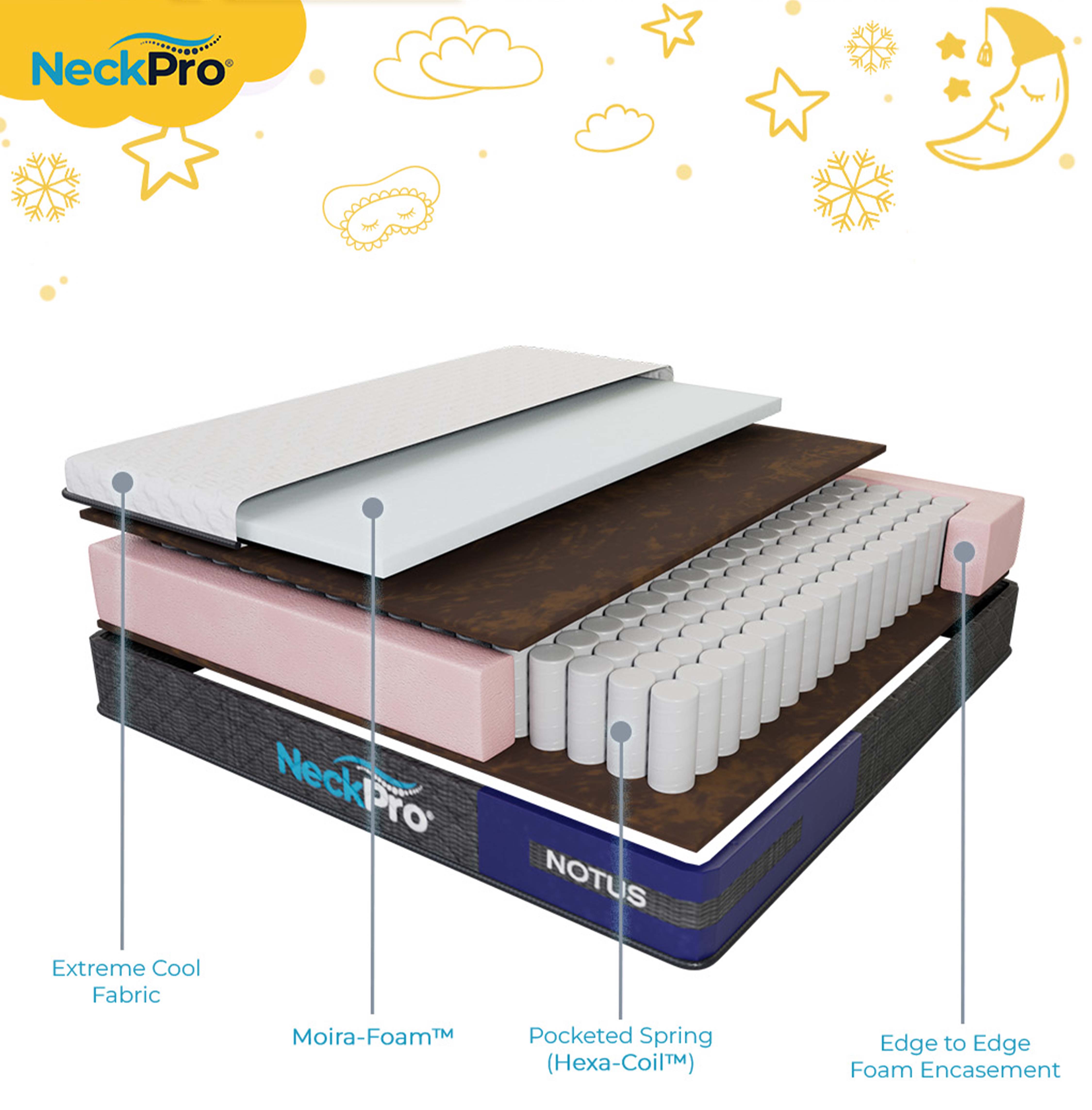 The NeckPro SUMO Series is trusted for its advanced support, cooling technology, and premium durability. Designed as a chiropractor-recommended alternative to traditional coconut fibre mattresses, the Notus delivers similar firmness yet is 50% lighter — making it easier to handle while maintaining superior strength and comfort.